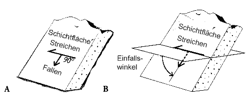 Abb. 2: Terminologie und schematische Darstellung der Aspekte, die für die Aufname einer Gesteinsschicht im Gelände relevant sind: A und B) Streichen und Fallen (Einfallsrichtung und -winkel) (modifiziert nach POWELL 1995).