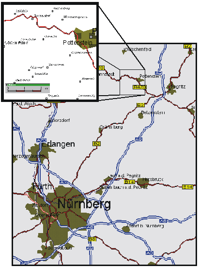 Das ca. 40 km² große Arbeitsgebiet liegt inmitten der Fränkischen Schweiz und ist ca. 10 km westlich der Autobahn Nürnberg-Berlin (A 9) und ca. 50 km nordöstlich von Erlangen entfernt. Es ist über die Bundesstraße 470 B zu erreichen. Es umfaßt Teile der Gemeinden Stadt Pottenstein im E und des Marktes Gößweinstein im W und beinhaltet 19 Ortsteile. Begrenzt wird es im W durch die Ortschaft Behringersmühle, im N durch die Ortschaft Rackersberg, im E durch den Haselbrunnbach und im S von den Ortschaften Kirchenbirkig und Trägweis. Oberflächig wird das Untersuchungsgebiet von der Püttlach und ihren Nebenbächen entwässert.